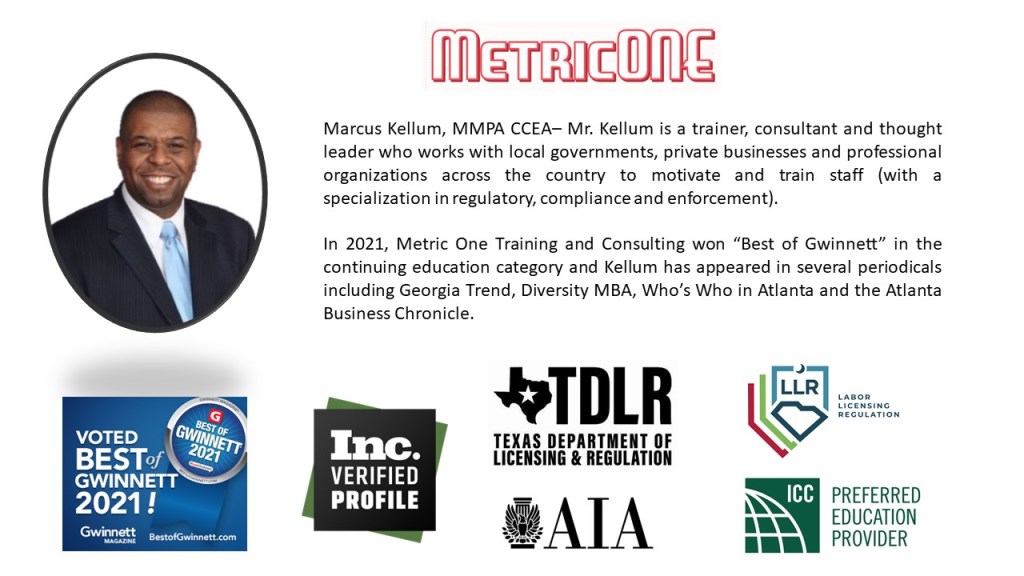 Marcus Kellum is a trainer, facilitator, and consultant who works with local governments, private businesses, and professional organizations nationwide to train and optimize their staff. An innovative and dynamic speaker, Marcus’ hands-on training style, engaging topics, and informative classes are nationally recognized. Marcus spent three decades in public service working with various cities and counties throughout the country and has held positions of compliance planner, code division manager, chief of enforcement, and department director. A registered civil mediator, certified code enforcement administrator, soil and erosion inspector, and property maintenance and housing inspector, he received a Leadership Effectiveness certificate from the University of Notre Dame’s Mendoza College of